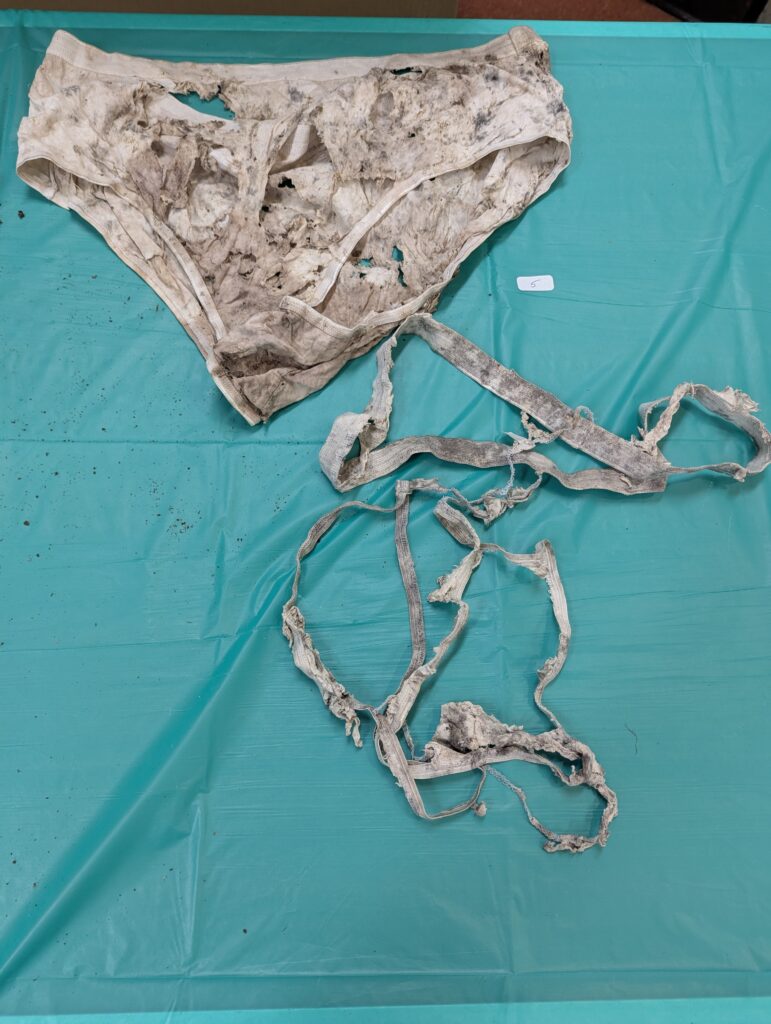 This Summer the members of the Ajax Garden Club participated in a “Soil Your Undies” experiment. At the beginning of July we planted white cotton underwear in our gardens and left them buried 6″ deep for 2 months.